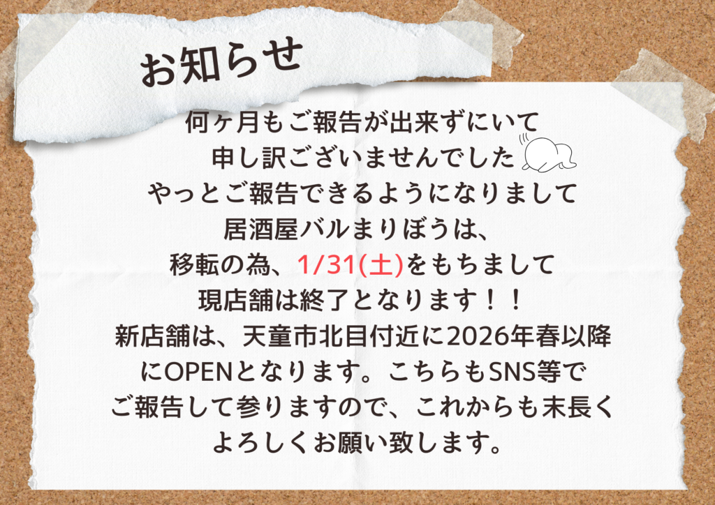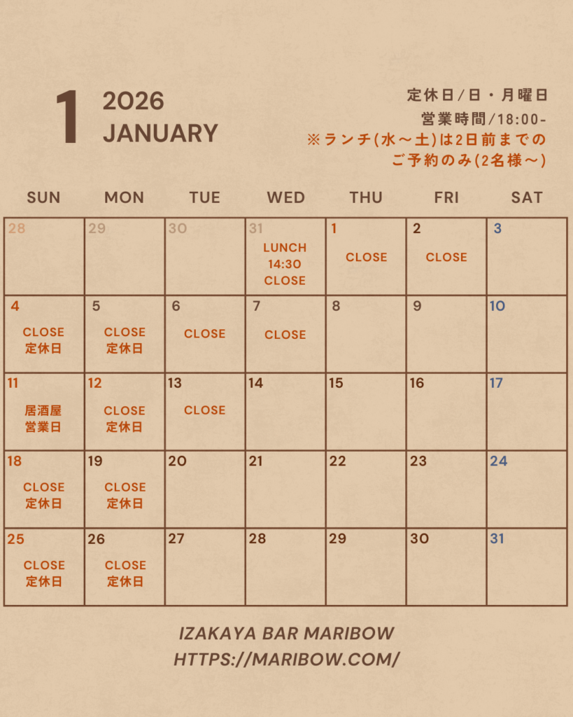 居酒屋 : (火)〜(木) 18:00〜22:00(L.O21:00)